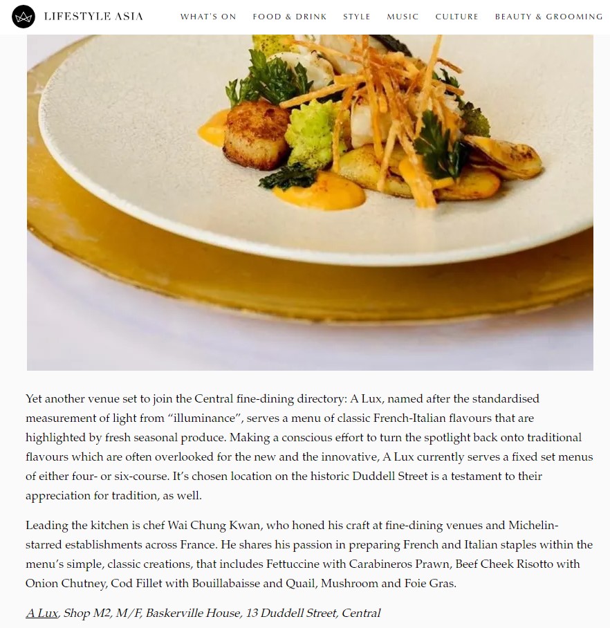 新店開幕:因疫情的關係,A Lux在開幕時並不能開設晚市,我們為A Lux準備了Early Dinner的時段, 邀請了新聞媒體和KOL,進行採訪,向大眾介紹餐廳的新菜式和環境,以提高餐廳的知名度。